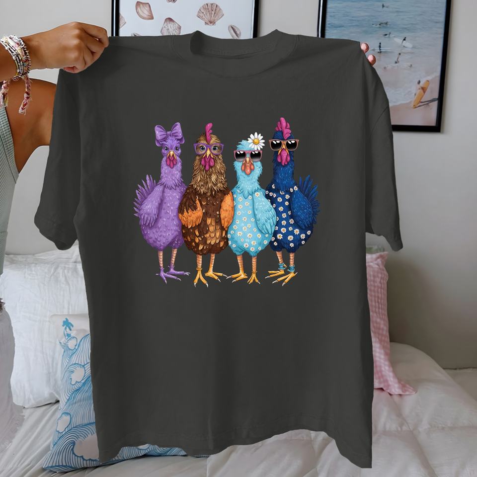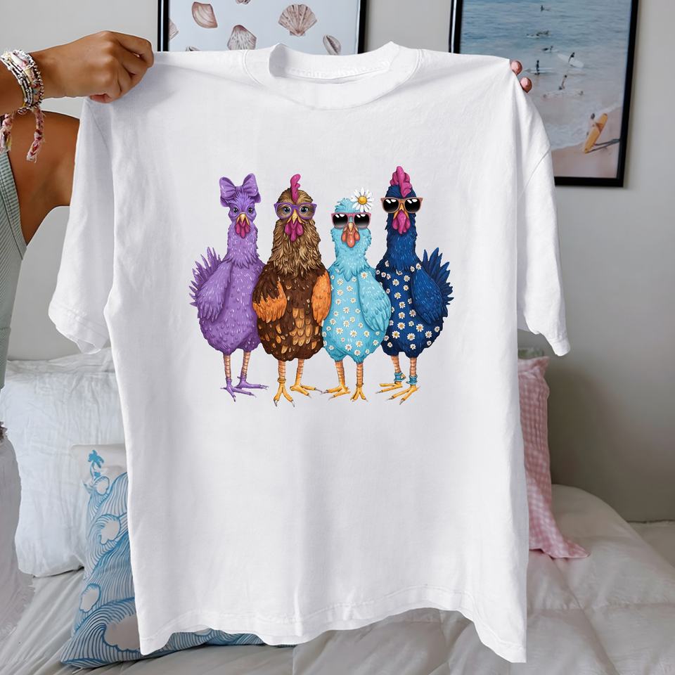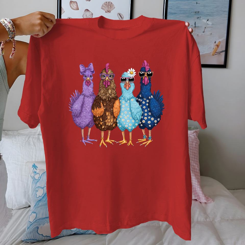 Anthropomorphic Chickens Illustration Casual Knitted Print 100% Cotton Women's T-Shirt Comfort Fit