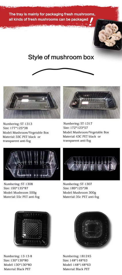 Anti Fog Fresh Mushroom Packing Tray PET Plastic Container for Shiitake Enoki and Oyster Mushrooms