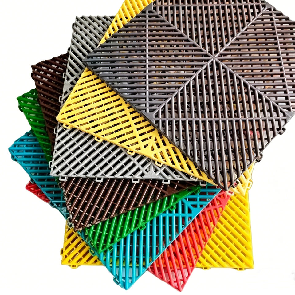 Dalles de sol modulaires emboîtables antidérapantes en plastique PP pour garage, vente en gros d'usine, revêtement de sol grillagé pour lavage de voitures et ateliers