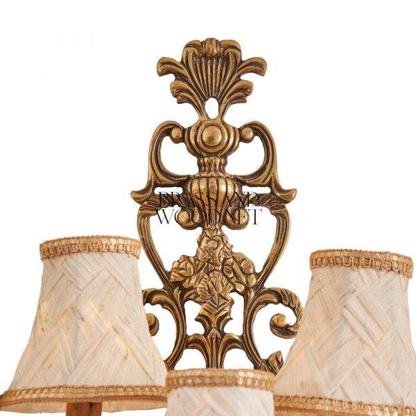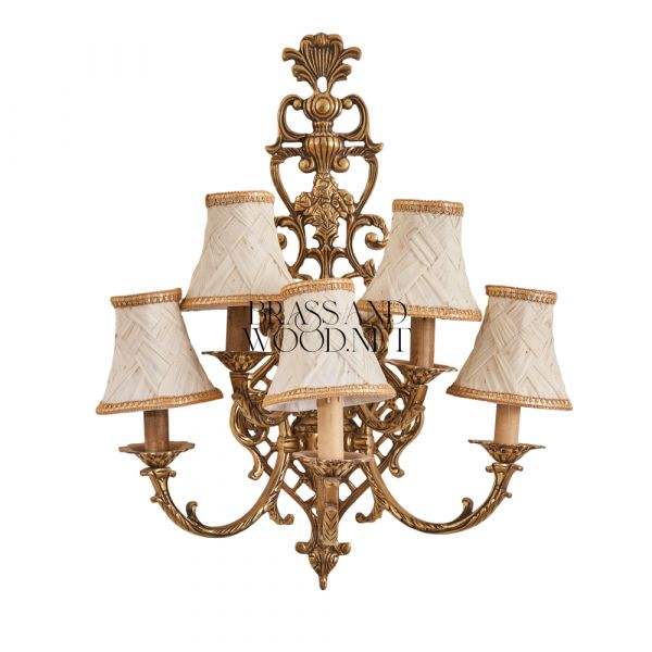 Applique murale en laiton antique avec cinq nuances en tissu Luminaire décoratif de luxe fait à la main avec un design sculpté orné