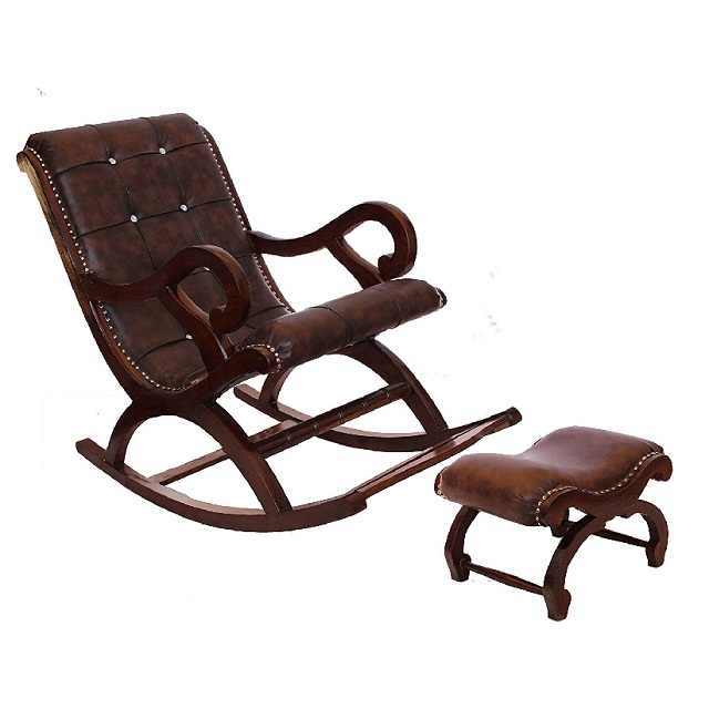 Fauteuil à bascule antique marron avec repose-pieds, fauteuil à bascule design en bois avec repose-jambes, fauteuil à bascule en teck avec repose-pieds