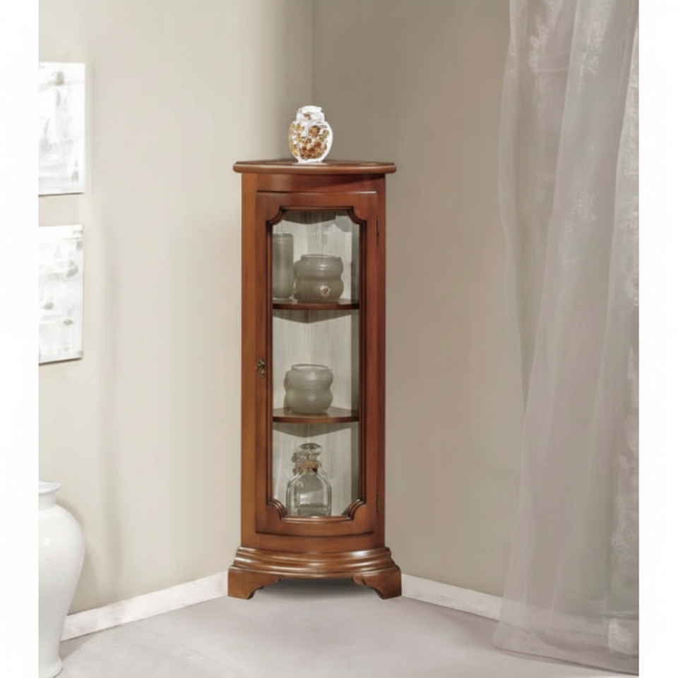 Vitrine d'angle antique avec fond Stoffa et 2 étagères en bois pour armoires de salon