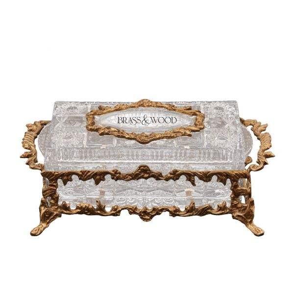 Antique Crystal and Aged Brass Tissue Box with Ornate Golden Frame and Elegant Handcrafted Detailing