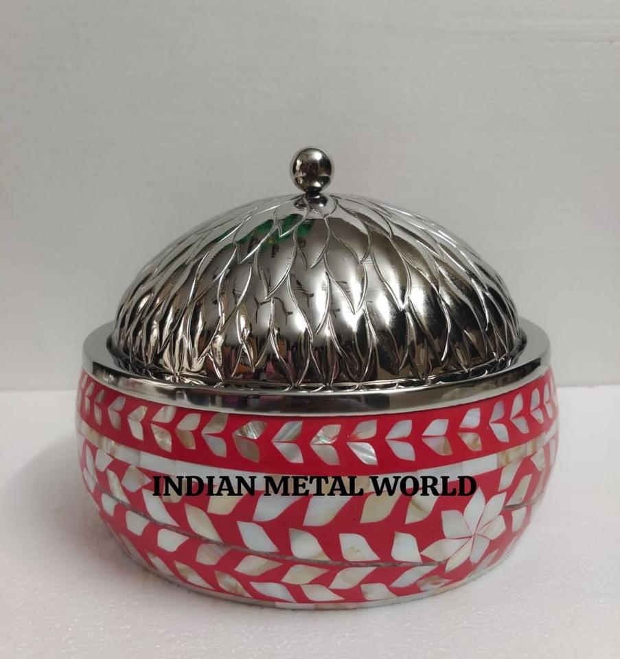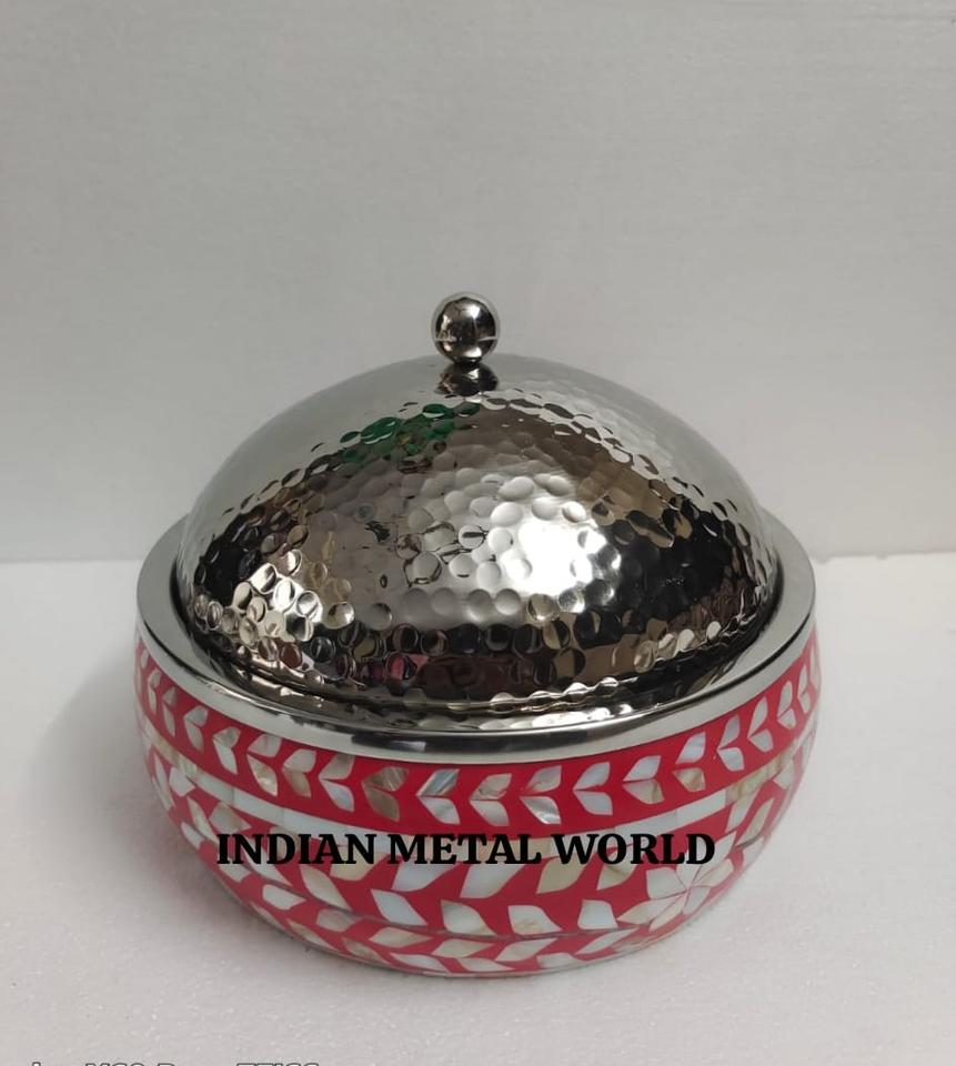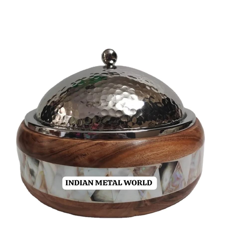 Plat de service et marmite au design antique en bois de première qualité et incrustation d'os en acier inoxydable pour la vente en gros d'ustensiles de cuisine