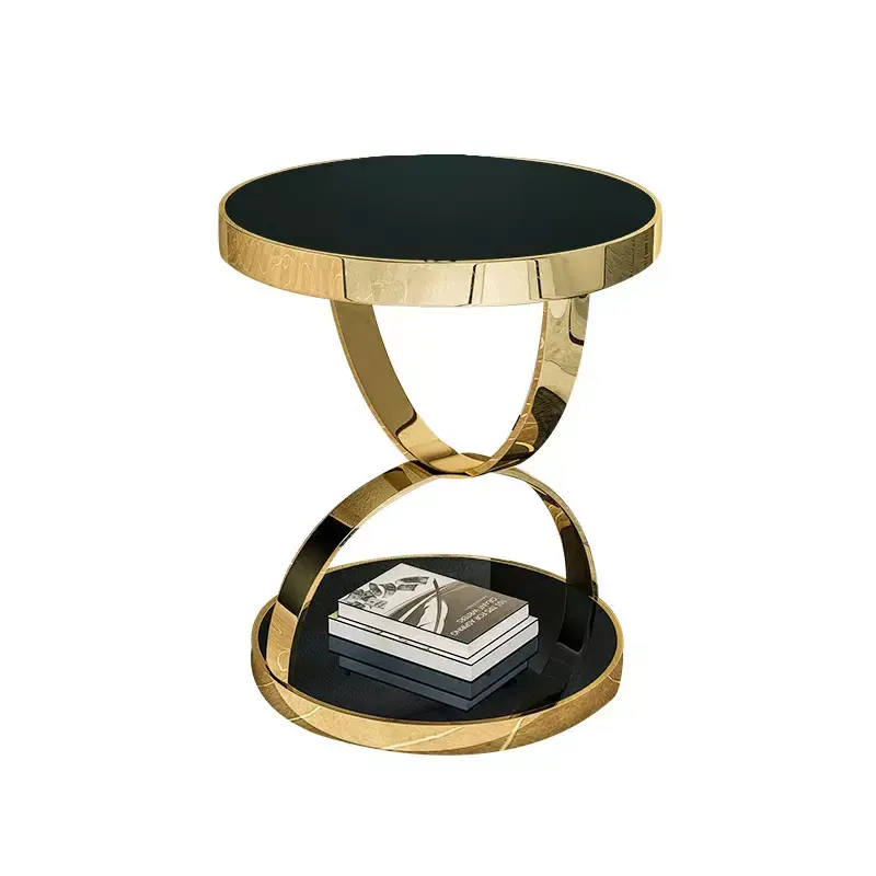 Table basse en fer de forme ronde au design antique, finition dorée, plateau en verre, table basse tendance pour la maison.