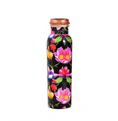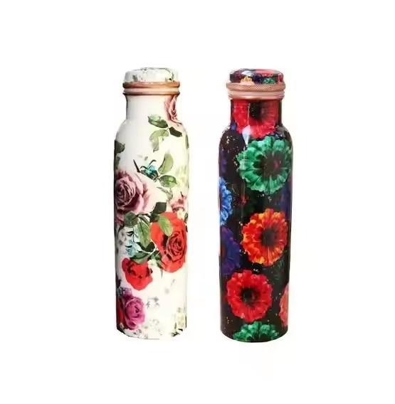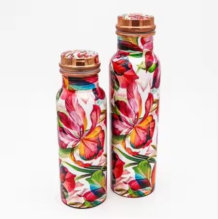 Bouteille d'eau en cuivre imprimée d'autocollant floral antique disponible avec des tailles personnalisées bouteille de prestations de santé disponible pour la vente