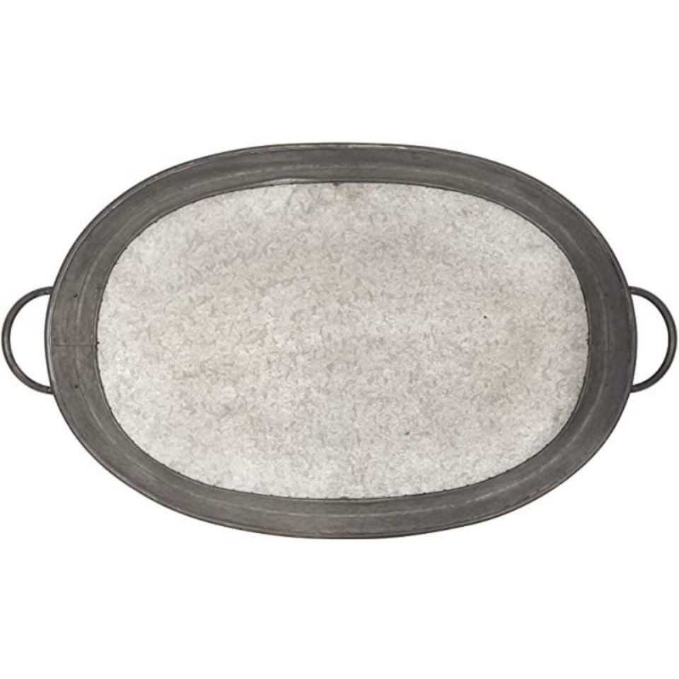 Plateau de service rectangulaire en acier galvanisé antique avec poignées en bois pour centres de table intérieurs et extérieurs en promotion