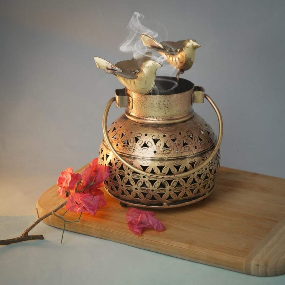 Antique Gold 11x12 inch Metal hundi Pattern with Bird Stand for Dhuni/Tea Light Candle Holder