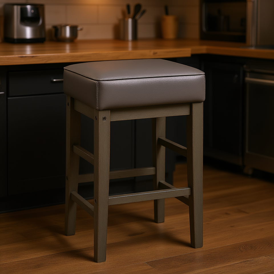 Tabouret de salle à manger avec structure en bois massif, hauteur de comptoir de 24 pouces, siège en similicuir gris antique, style transitionnel