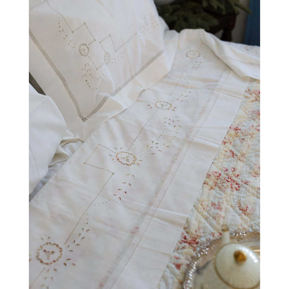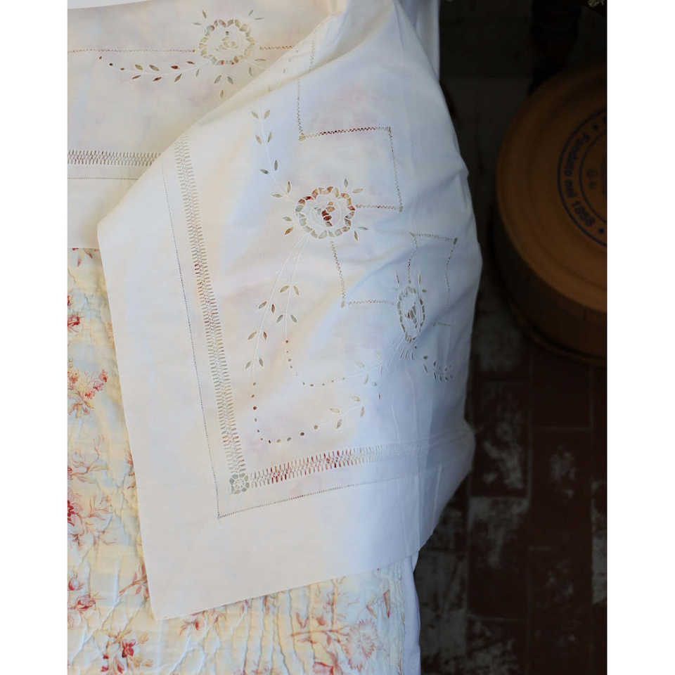 Drap en lin antique Pietrochianese avec broderie ajourée, draps plats et housses de matelas élégants