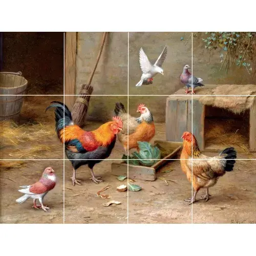 Antique Repro Poulet Coq Tuile Murale Dosseret Animaux de la Ferme Temps d'Alimentation Décoration Murale