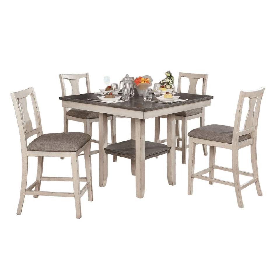 Ensemble de salle à manger rustique 5 pièces blanc antique, chaises hautes uniques et table haute avec étagère, meubles blancs antiques