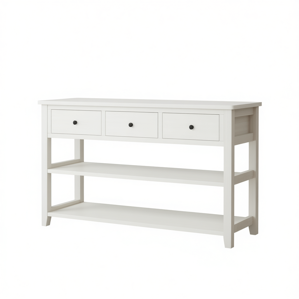 Console d'entrée en bois blanc antique avec 3 tiroirs et 2 étagères, meuble pour salon