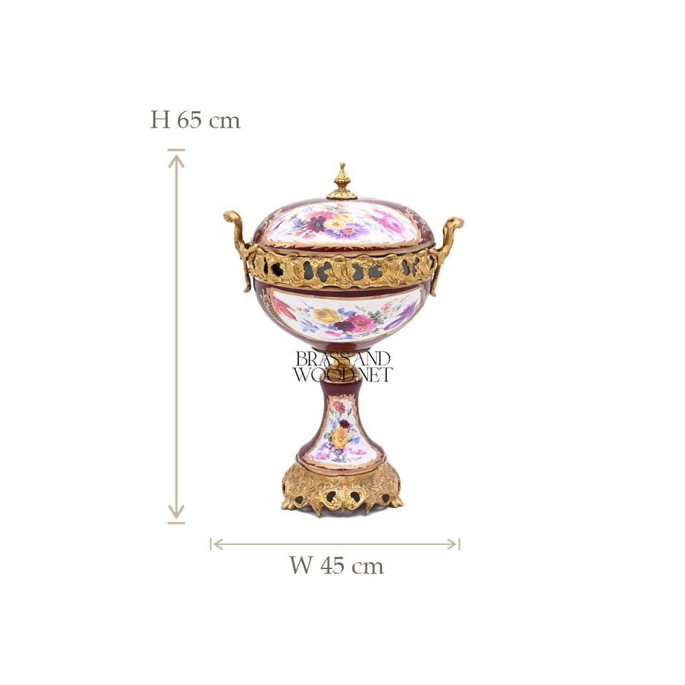 Antique brass and porcelain covered bowl with floral painting ornate detailing vintage inspired design and luxurious