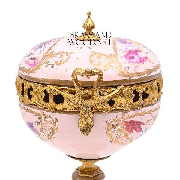 Antique brass and porcelain covered bowl with light floral painting ornate detailing vintage inspired design and luxurious