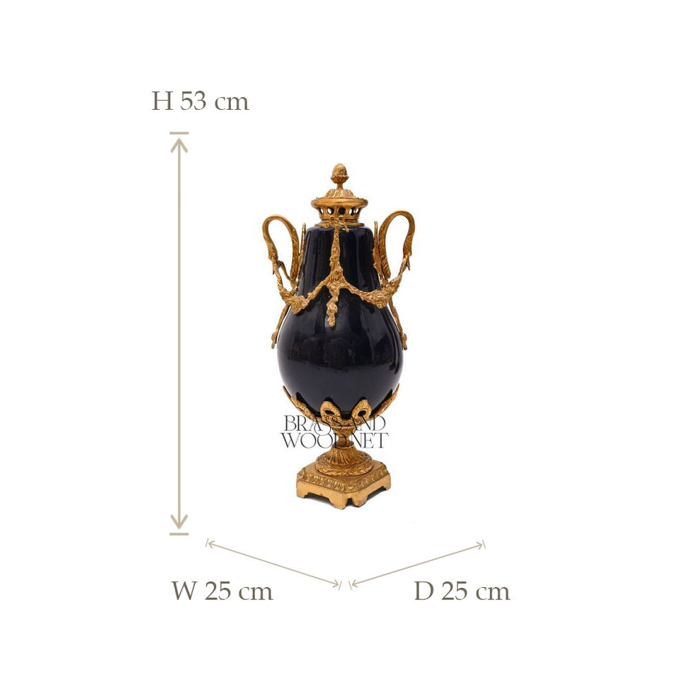 Antique brass and porcelain decorative vase with navy finish ornate golden detailing vintage inspired design and luxurious