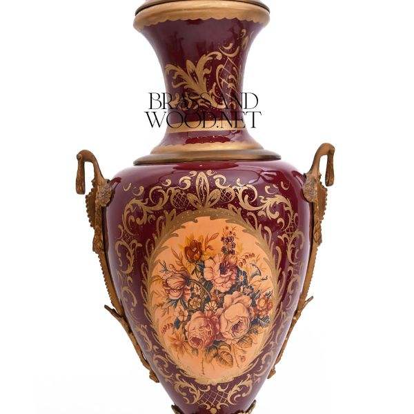 Antique brass and porcelain decorative vase with burgundy floral painting ornate detailing vintage inspired design