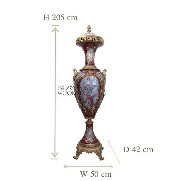 Antique brass and porcelain decorative vase with burgundy landscape painting ornate detailing vintage inspired