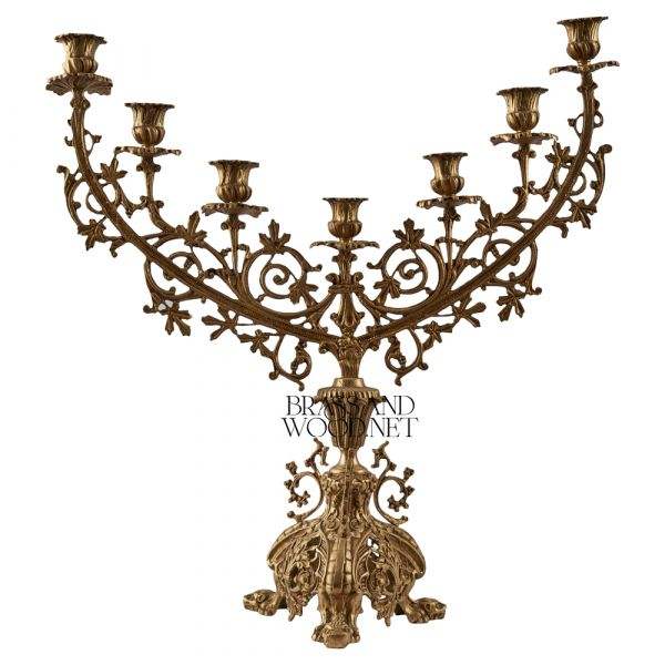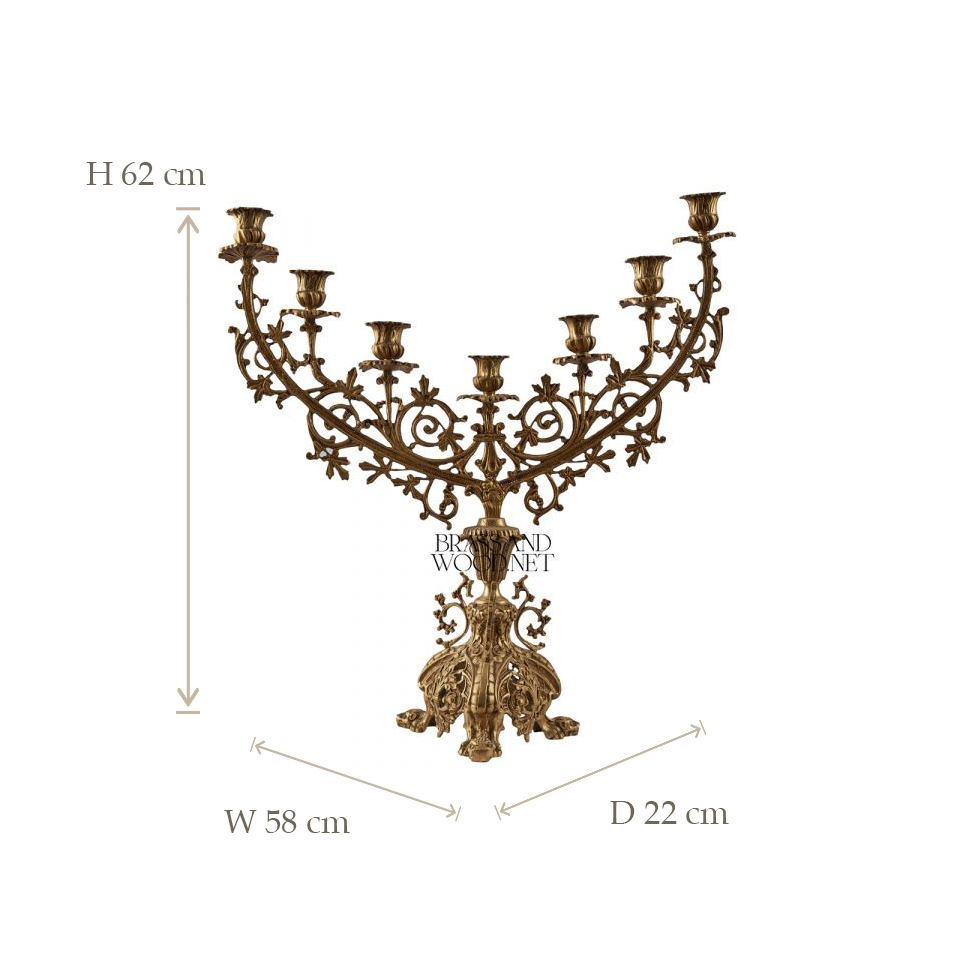 Antique brass candelabra with intricate floral engraved design and seven arms for classic luxury home decor