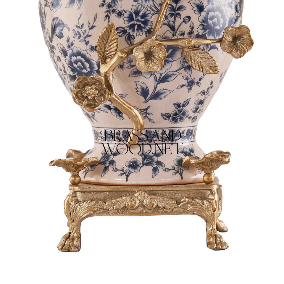 Antique brass table lamp porcelain body with blue floral design golden ornate base and fabric shade luxury decorative lighting