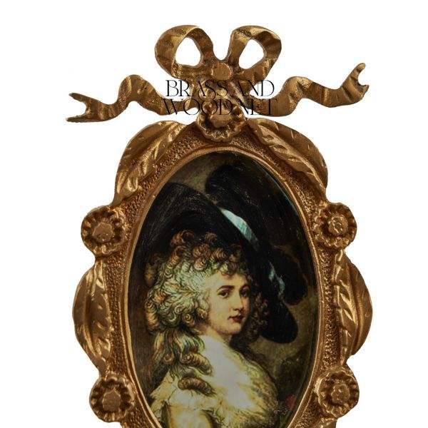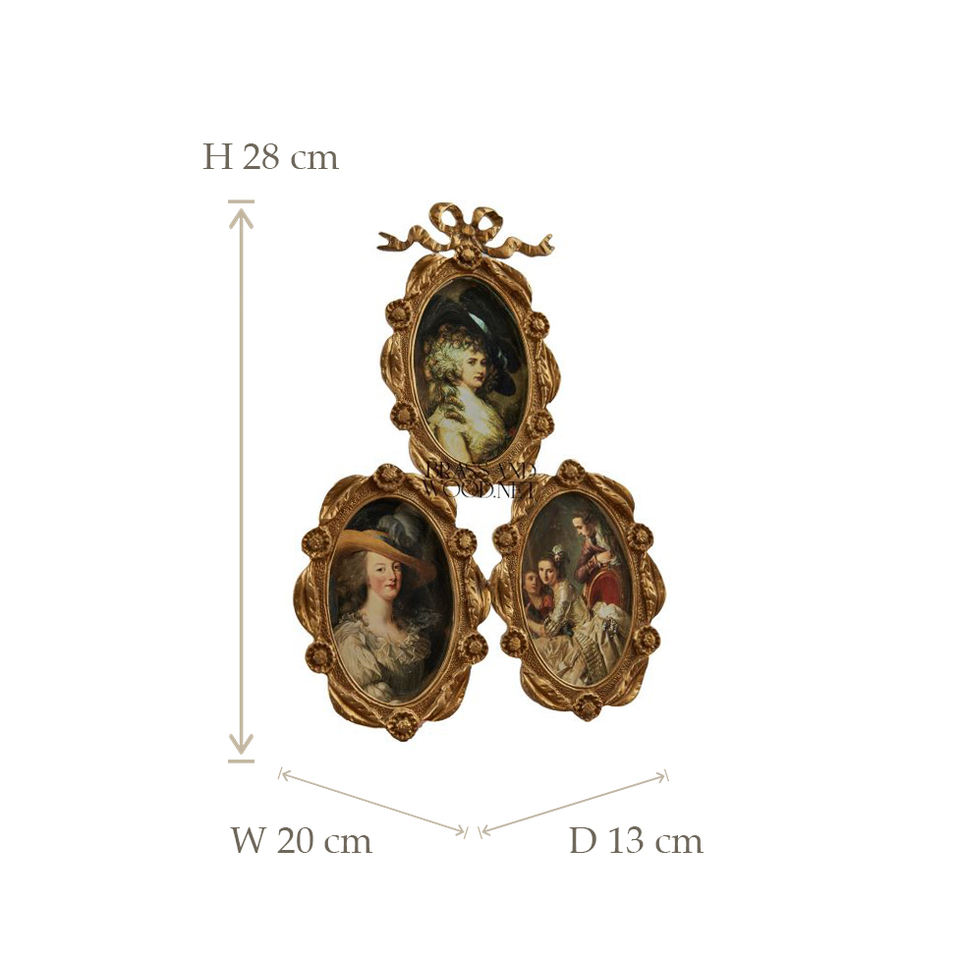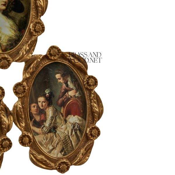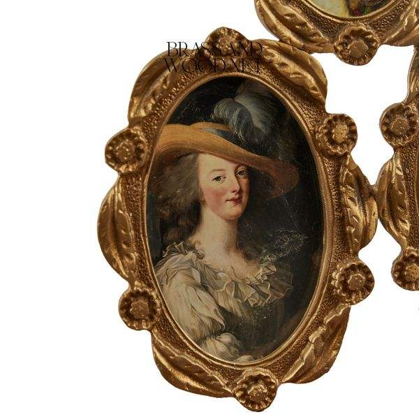 Cadre mural en laiton antique avec trois portraits ovales de style européen classique décorés d'élégants détails floraux