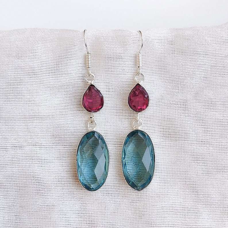 Aqua Apatite & Pink Tourmaline Earrings 925 Silver Plated Multi Stone Ear Wire Faceted Crystal Dangle Handmade Gift for Her