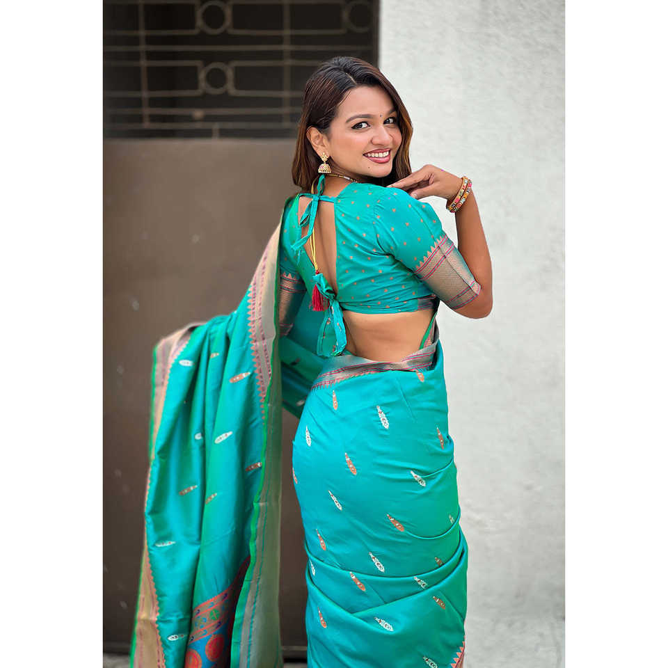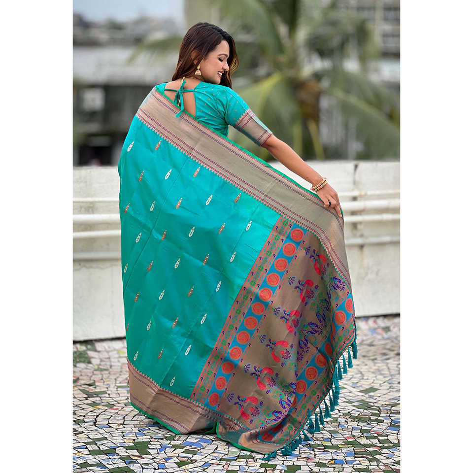 Aqua Blue Yeola Traditional Paithani Silk Saree Dual Zari Woven Evening Dress