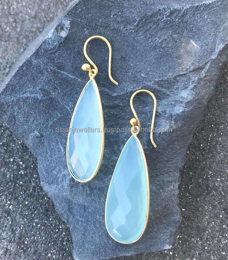 Boucles d'oreilles en pierre précieuse de calcédoine Aqua, bijoux indiens en argent sterling 925 et plaqué or, faits à la main, bijoux asiatiques