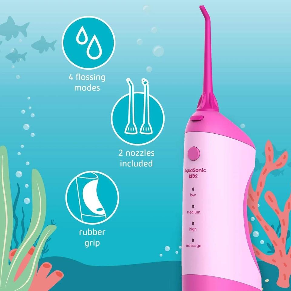 AquaSonic Kids' Water Flosser for Ages 6+ | Standard Nozzle, Orthodontic Nozzle & Waterproof Stickers | 4 Flossing Modes