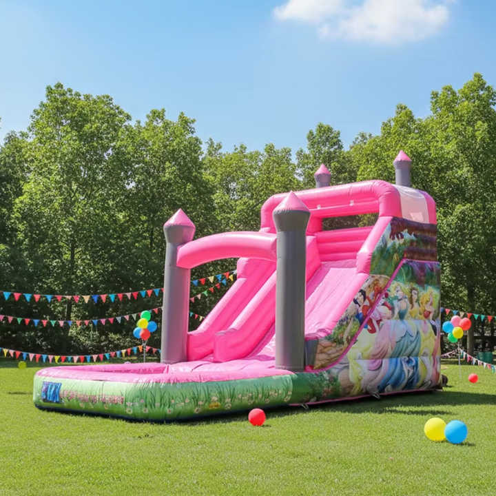 Toboggan aquatique gonflable rose avec piscine