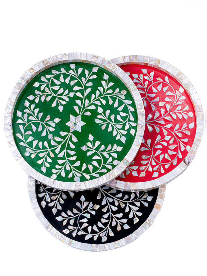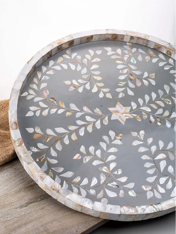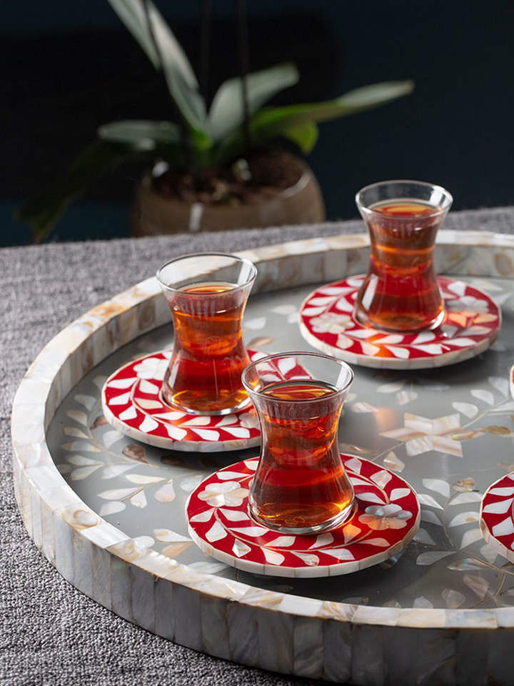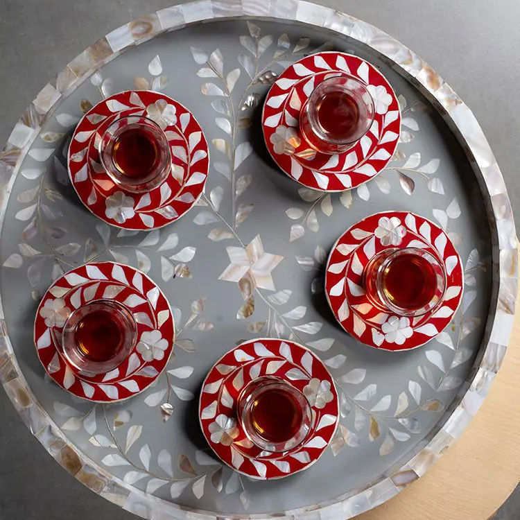 Plateau de service rond en bois et résine fait à la main avec incrustation de nacre de style arabe, motif floral, ensemble de 5 sous-verres en nacre, Ramadan Eid