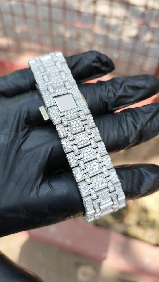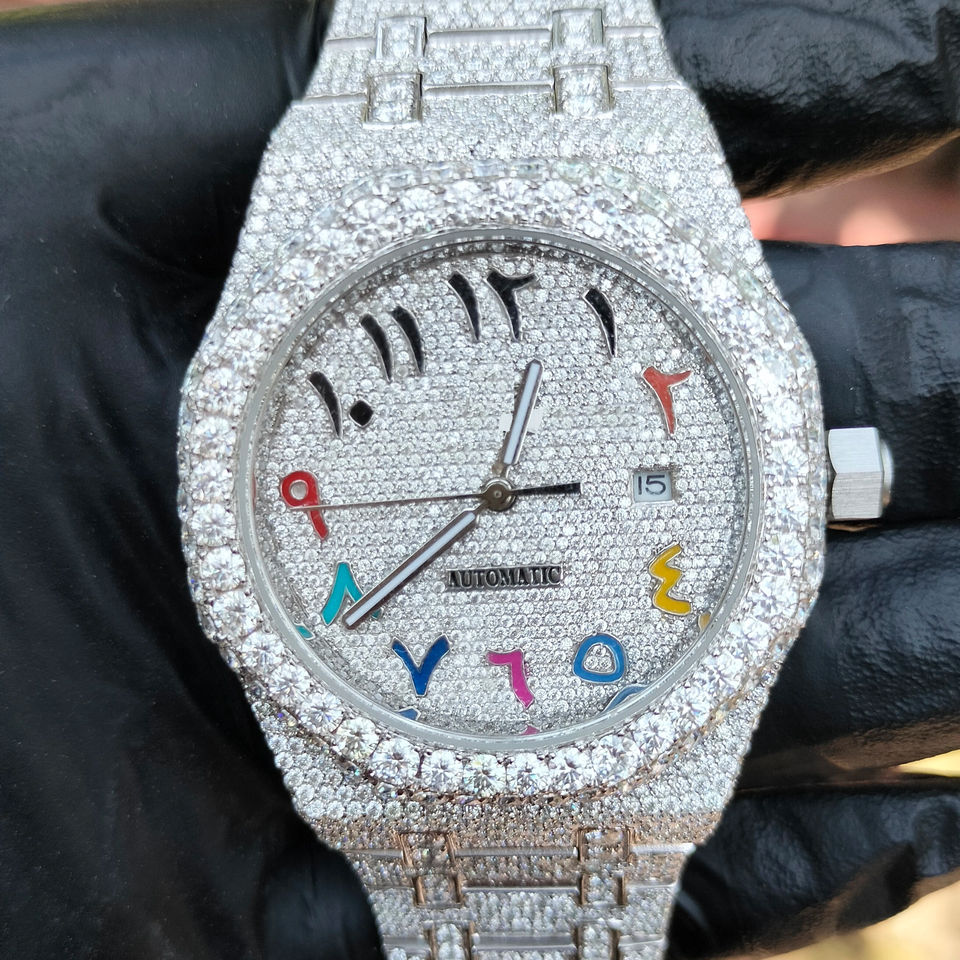 Montre mécanique personnalisable en acier inoxydable, entièrement sertie de moissanite, avec cadran arabe et breloque antique