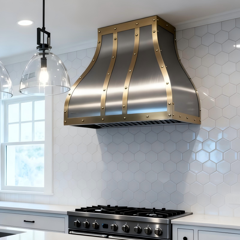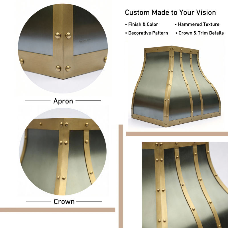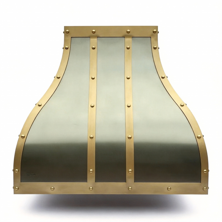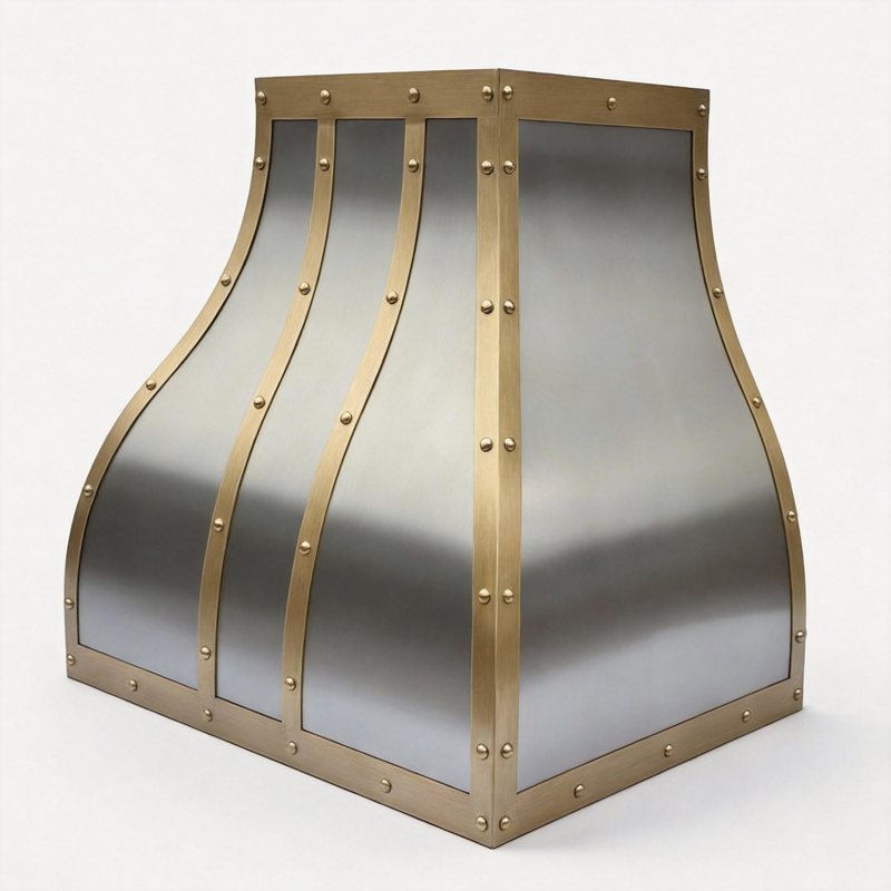 Hotte de cuisine en acier inoxydable de calibre lourd, forme cloche incurvée, avec sangles en laiton, pour villa européenne moderne de luxe