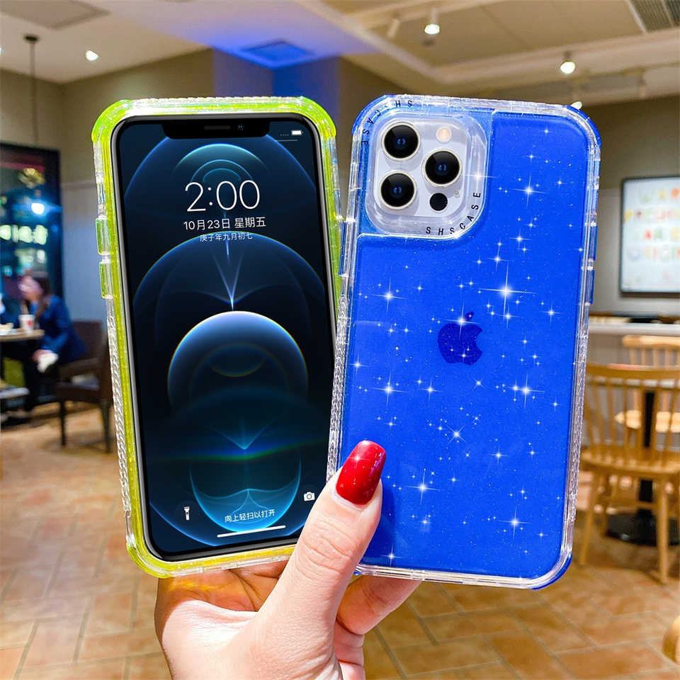 Armor 3-in-1 Tough TPU Phone Shell for iPhone 16 15 14 Plus Pro Max Clear Cover with Shiny Glitter Mobile Phone Bag Casing
