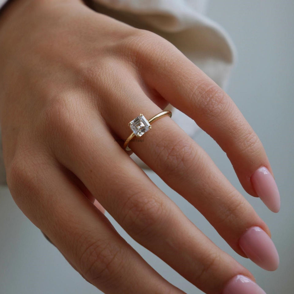 Bague solitaire en diamant Moissanite Art Deco Asscher Cut avec pierre de 6mm dans un sertissage unique double quatre griffes idéal pour le mariage