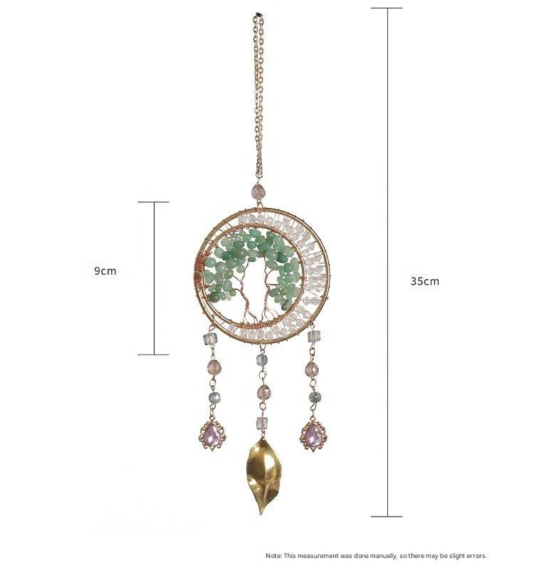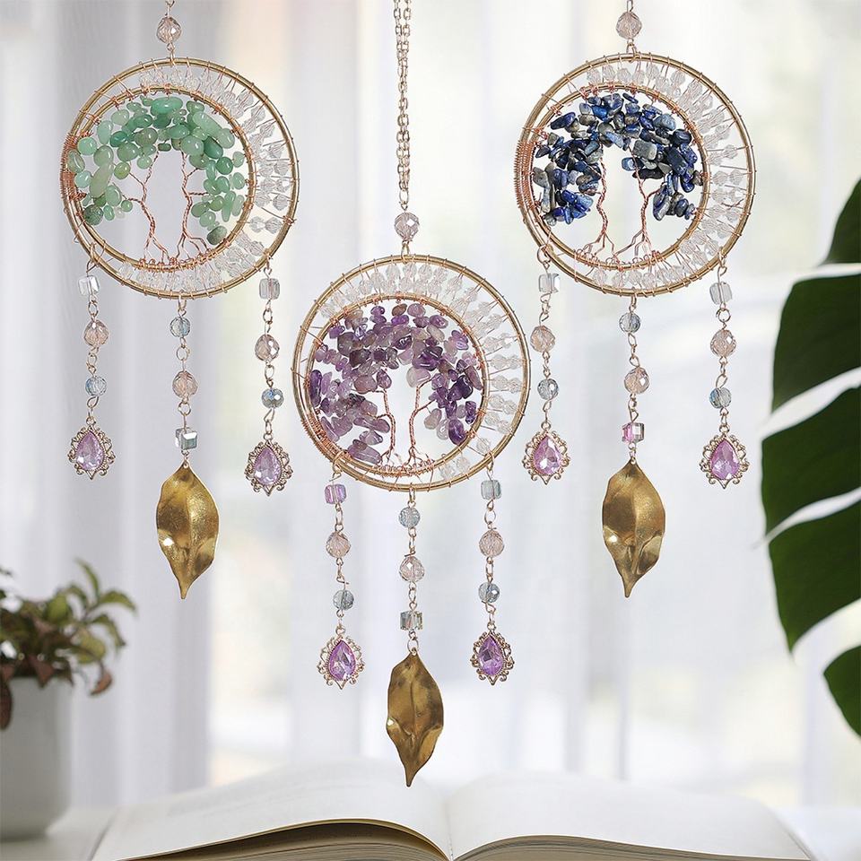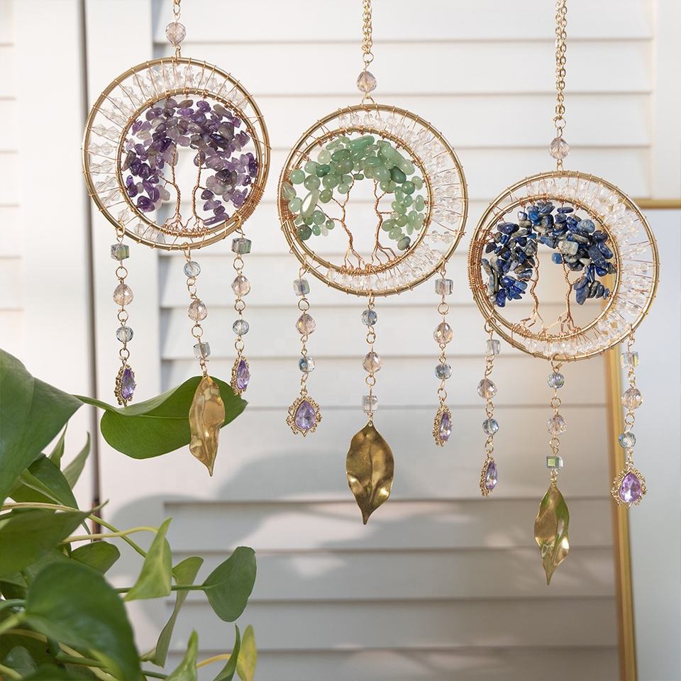 Carillon à vent et attrape-rêves en cristal d'améthyste de style Art Déco, arbre de vie naturel, décoration murale en pierres précieuses, décoration extérieure