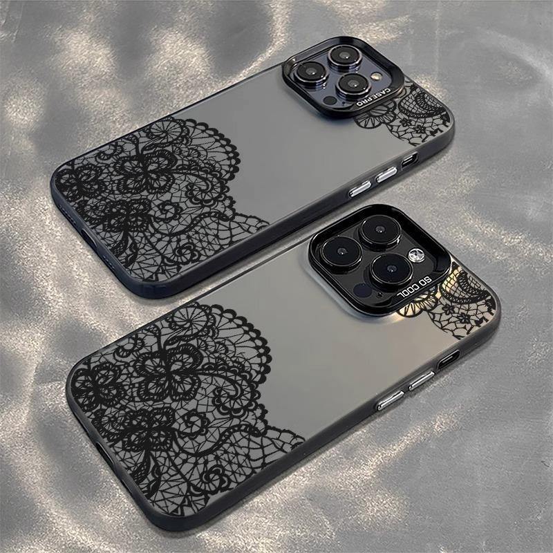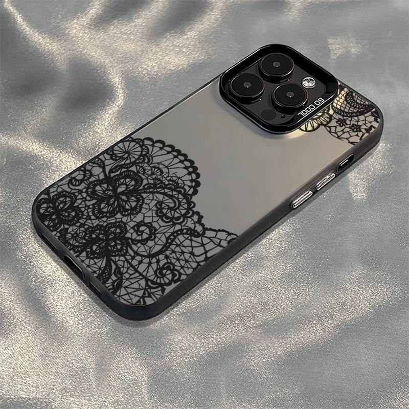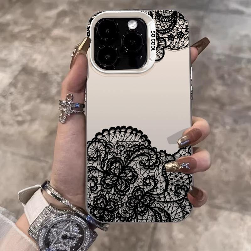 Coque de téléphone portable TPU pour Iphone X Xr Xs 11 12 13 14 15 16 17 Pro Max Art Lace Black Flower Printing Electroplated Silver Key TPU PC