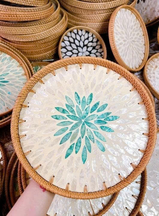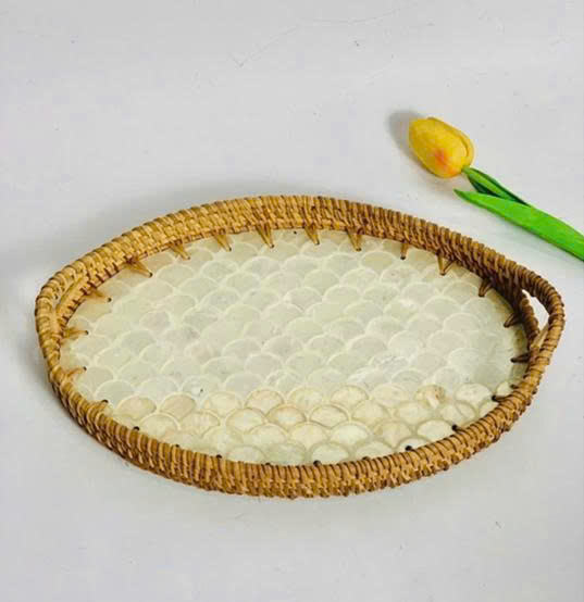 Plateau en rotin artisanal pour rangement décoratif, aménagement intérieur et présentation élégante de la maison
