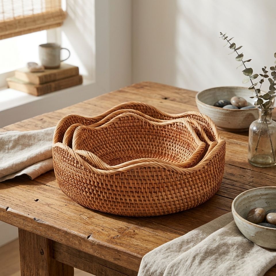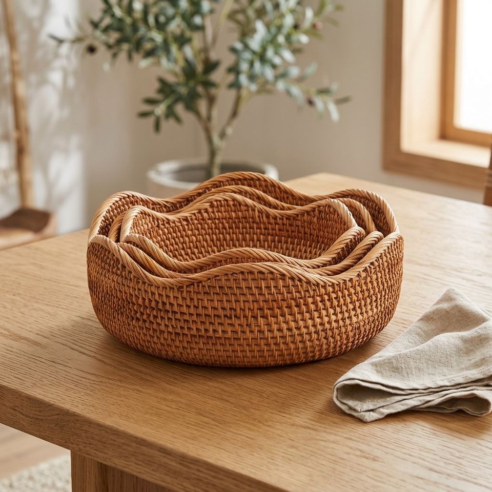 Plateau rond artisanal en rotin avec bord ondulé unique, panier de rangement tissé à la main pour fruits et légumes, vente en gros d'usine