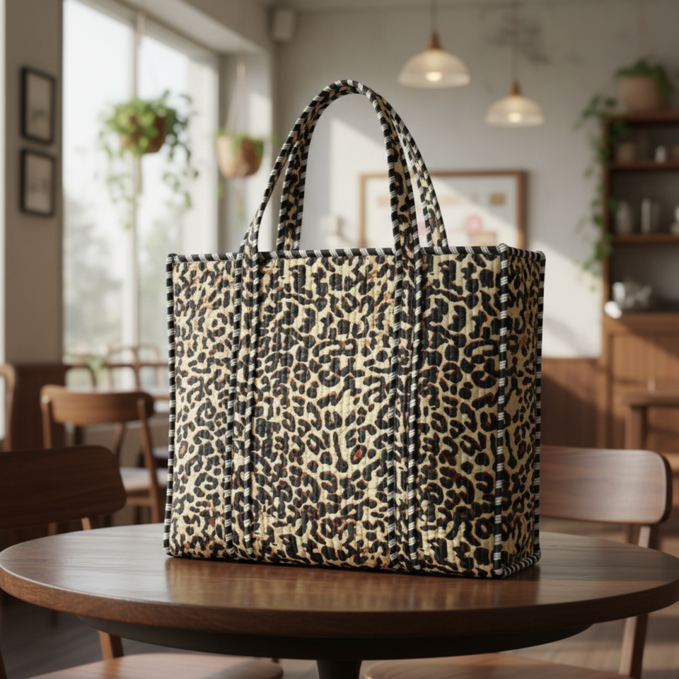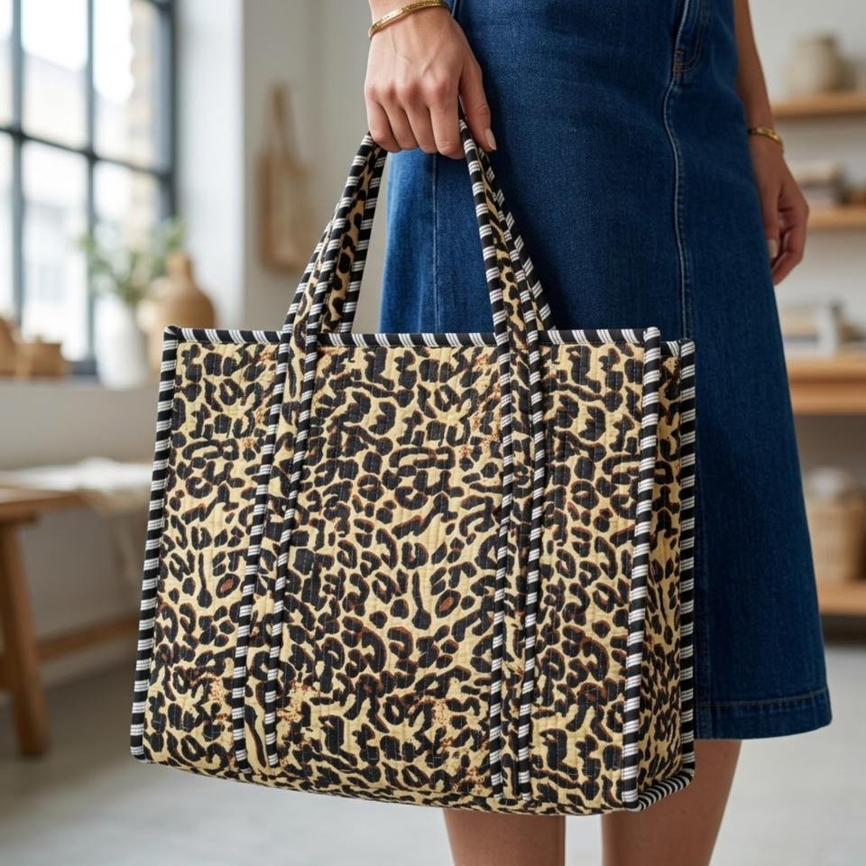 Sac à main matelassé artisanal à motif tigre, sac fourre-tout en tissu 100% coton avec passepoil rayé noir, chef-d'œuvre de haute qualité