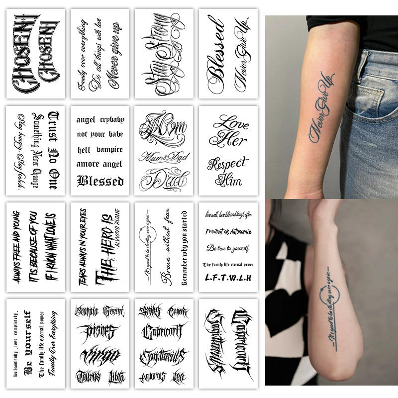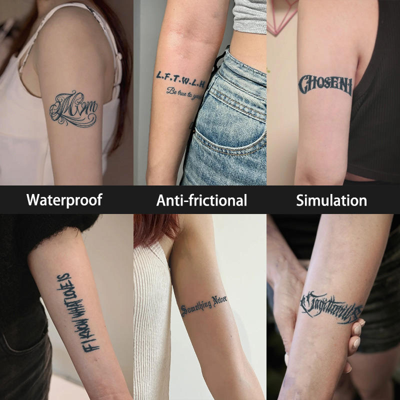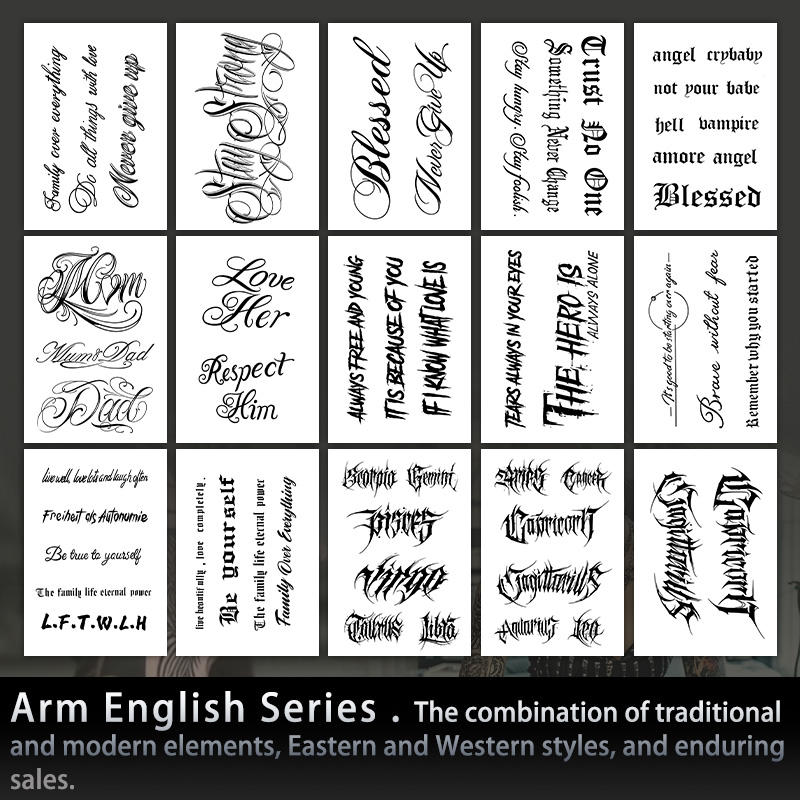 Tatouage temporaire de lettrage gothique artistique tatouage semi-permanent imperméable dure 2 semaines tatouage à base de plantes réaliste pour le corps du bras