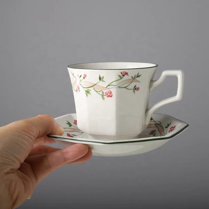 Artistic Polygon Ceramic Tea Cup and Saucer Underglaze Color Concentrated Bitter Coffee Decorated with Plant Flower