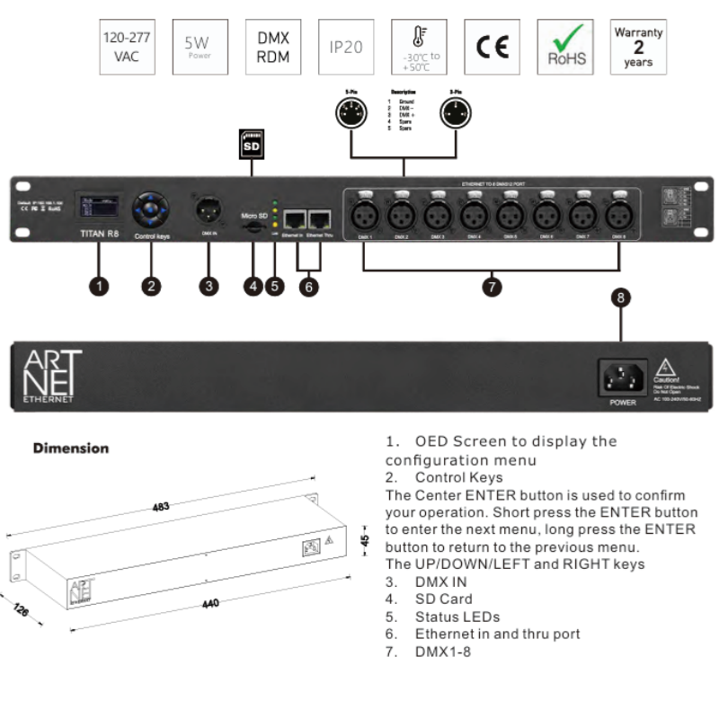 Sorties DMX:8 sorties (chaque sortie 512 canaux DMX)