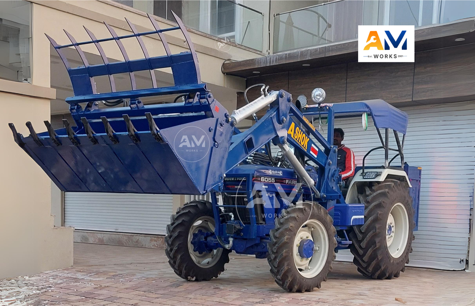 Chargeur de chantier Ashok Metal Works avec godet 4-en-1 pour tracteur Eicher, hauteur de levage 16 pieds