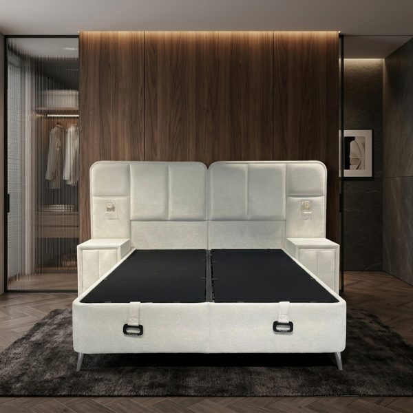 Base de lit rembourrée Mundo Bedding avec rangement, tête de lit à chargement sans fil, levage hydraulique, tailles et couleurs personnalisables, panneau MDF, confort B2B