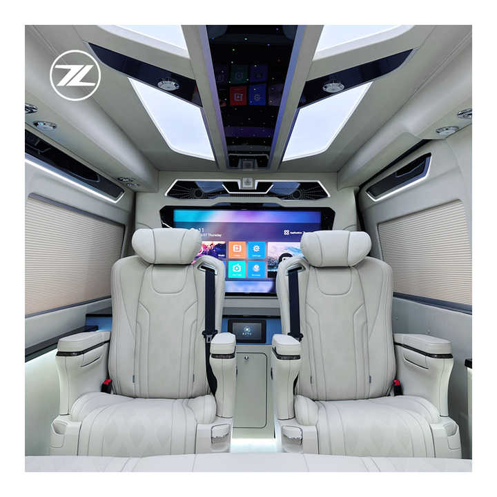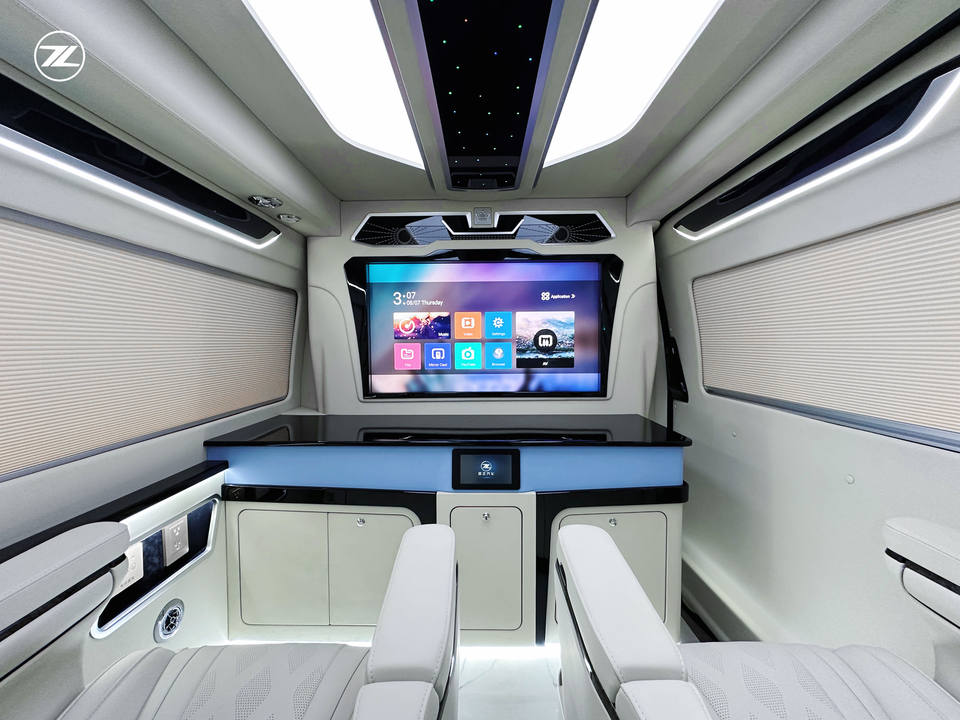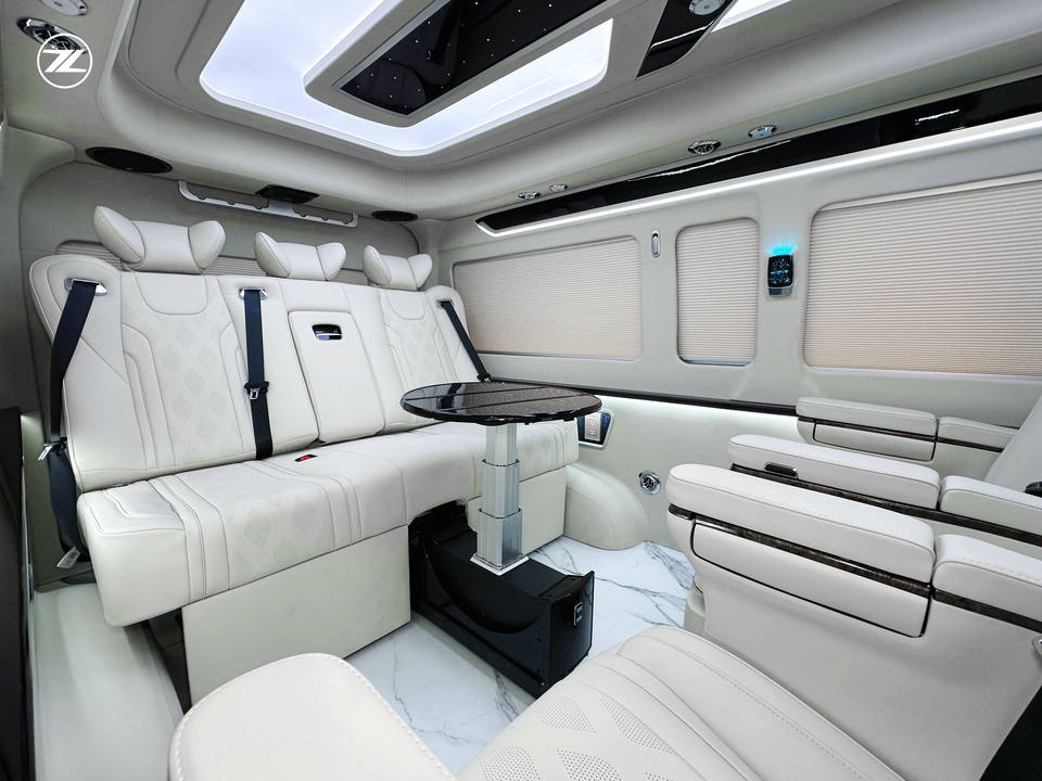 Conversion de fourgon Aspire | 7 places, sièges en cuir, intérieur blanc, séparateur d'intimité, transmission automatique, LED, luxe pour Hiace