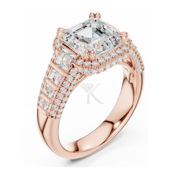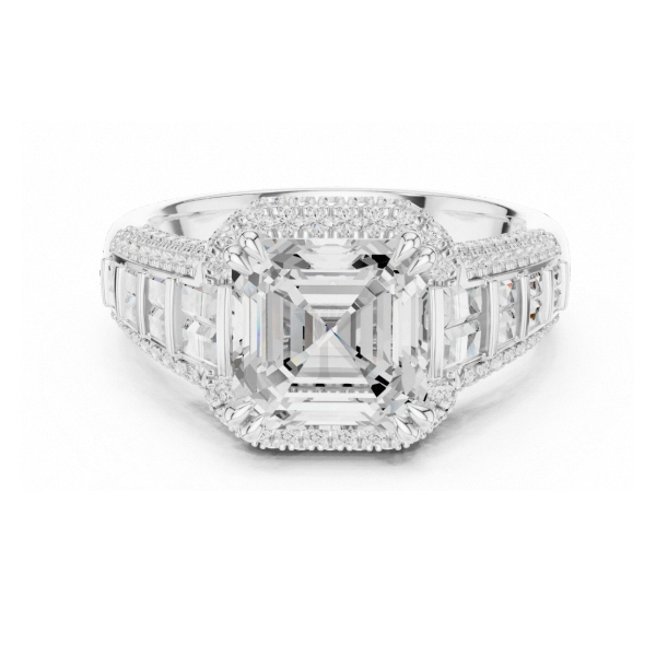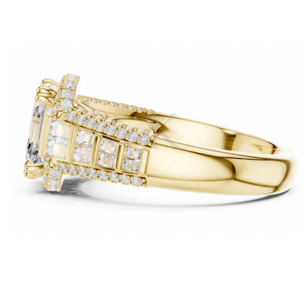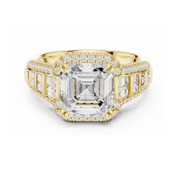 Bague de fiançailles taille Asscher en or jaune avec halo de diamants, baguettes et pavé, large bande, bague statement, bijoux de mariée élégants