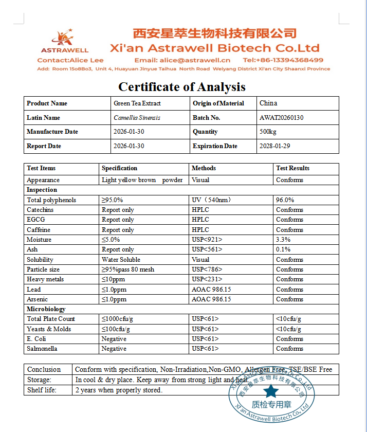 Astrawell Extrait de Thé Vert Naturel en Poudre 95% Polyphénols 45% EGCG Camellia Sinensis Vente en Gros Fournisseur OEM
