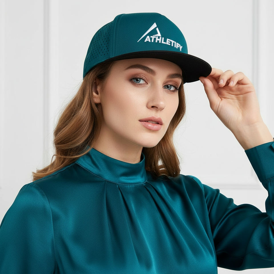 Casquette de baseball Athletify personnalisée OEM découpée au laser, en softshell respirant, ajustée, pour le sport, avec impression numérique, quatre modèles