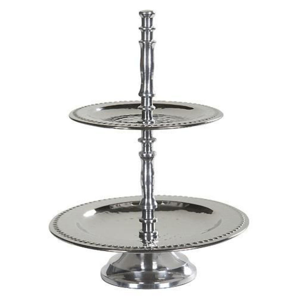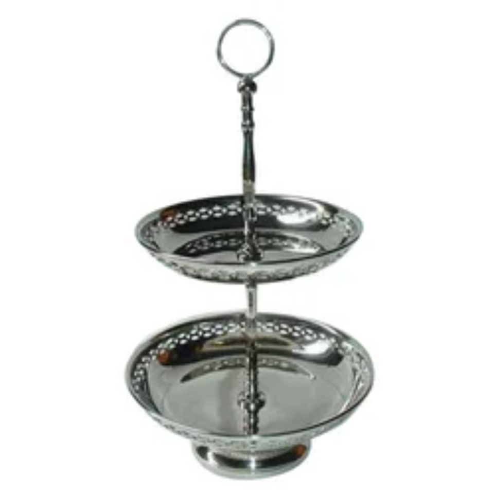Support de service à buffet en acier et aluminium, finition argentée, bord perlé, design attrayant, 2 niveaux, pour mariages, fêtes et décoration intérieure